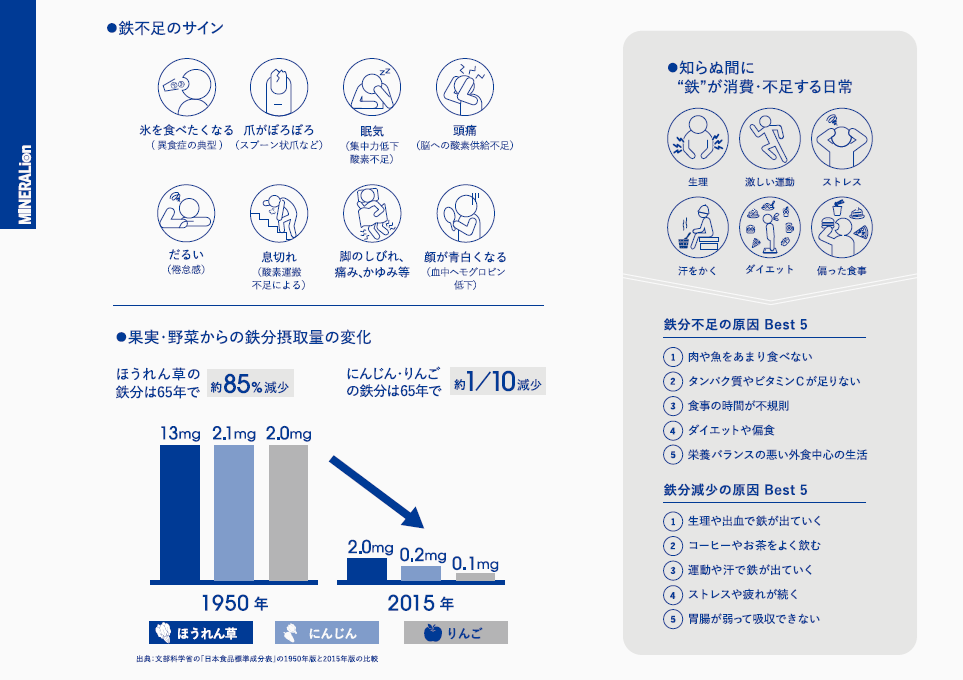 鉄分は血中のヘモグロビンを作り、酸素を全身に運ぶ役割を持つので、疲れやすさ・顔色の悪さ・集中力低下、美容面の不調などをサポートします。
